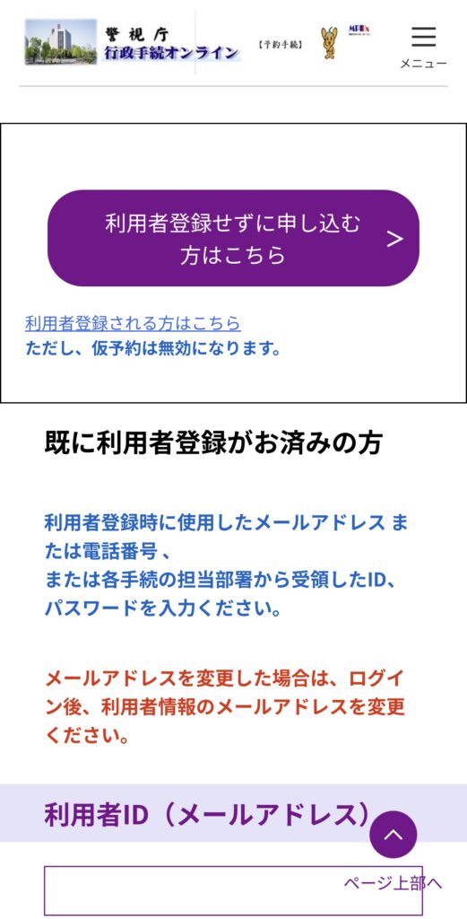 オススメは、一番上の「利用者登録せずに申し込む方はこちら」 をクリックし進むことです。入力作業が余計に増えてしまうからです。他にも 警視庁の行政手続オンラインの手続きを使われる方は利用者登録をされても良いと思いますが、登録しなくてもマイナ免許証の手続きに影響はありません。