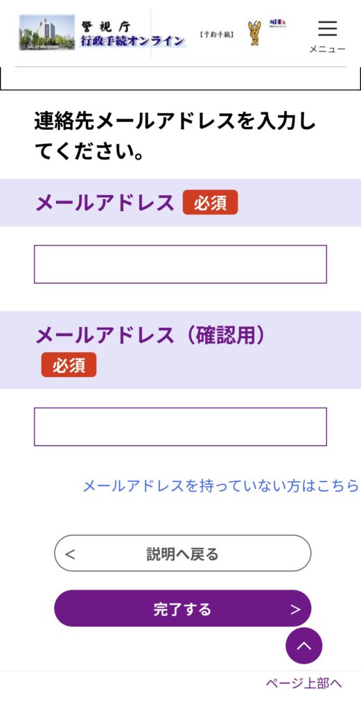 「連絡先メールアドレス」 の入力を求められますので、ご自身のメールアドレスを2回入力してください。