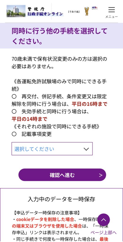 下部に、同時に行う手続きがある場合は選択できる項目がありますが、マイナ免許証の保有状況変更のみであればなにも選択しなくて良いです。 「確認へ進む」で次へ進みます。