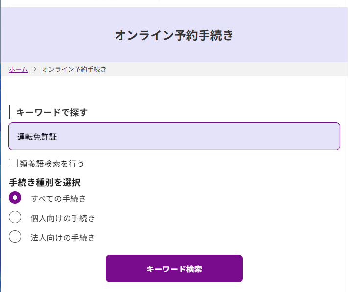 続いて、 手続きの検索を行います。 今回は、個人がマイナ免許証の手続きを行うので、キーワードに「運転免許証」と入力し、その下の「個人向けの手続き」を選択しキーワード検索を行います。