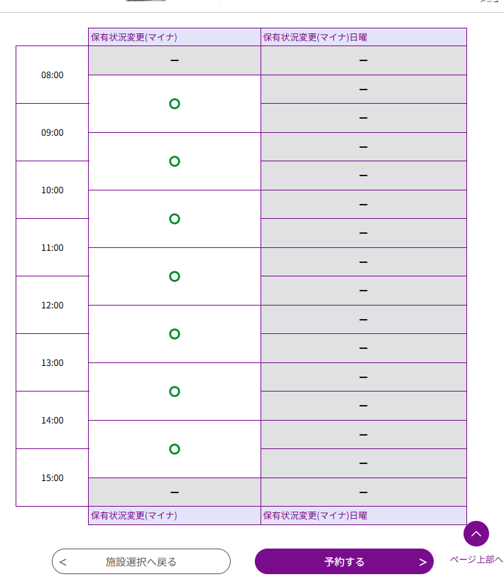 続いて、選択した日時の予約が可能な時間帯があります。画像はすべて予約が可能になっている例ですが、予約が埋まっている時間は赤色のバツ×が付いておりクリックできないようになっています。